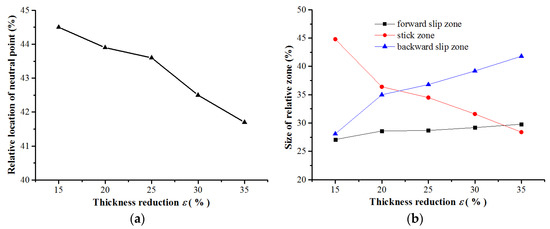 The plate was deformed by extrusion forces from the rollers, and springback occurred after plastic deformation. The contact pressure in the forward slip zone can be regarded as the load from the roller to resist the plate’s springback. The resistance from the roller was constant at the forward slip zone because the plate thickness was unchanged even if the thickness reduction increased (Figure 9). However, the resistance from the roller increased in the backward slip zone with the increase of the thickness reduction because the blank thickness was increased. This means that the neutral point moved towards exit section and the rate which represents relative location decreased with the increase of the thickness reduction, as shown in Figure 10a. Kazeminezhad and Taheri [17] studied rolling pressure distribution and investigated the variation of the location of the neutral point. Their results showed that the neutral angle increased with the increase of the thickness reduction. However, the increment of neutral angle was smaller than the increment of total rolling bite, which was confirmed by the result in Figure 10a. When the thickness reduction increased, the percentage of the forward slip zone increased slightly and the backward slip zone was increased significantly because the loading and length of rolling bite increased. The percentage of stick zone decreased significantly because the percentages of both the forward and backward slip zone increased, shown in Figure 10b. This agrees with the analytical model proposed by Minton et al. [28].
