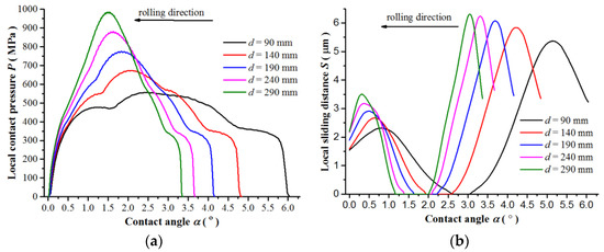 The diameter of the roller is also an important parameter for the rolling process. The local contact pressure and sliding distance were simulated using different roller diameters, while the values of the other parameters were unchanged. The simulation results are shown in Figure 11. When the roller diameter was increased from 90 to 290 mm, the length of the rolling bite was increased from 4.8 to 8.5 mm and the angle of rolling bite decreased from 6.04° to 3.37°. While angular speed was constant, the forming speed at the exit section increased when the diameter of the roller increased. The local contact pressure had a hill-shaped profile and the magnitude of the peak increased significantly from 555 to 984 MPa. The increase in the contact pressure is due to the increase in the rolling force. For the same thickness reduction, a larger roller leads to a longer roller bite and needs a larger rolling force. The local sliding distance curve had double peaks, as shown in Figure 11b. The maximum of the local sliding distance increased from 5.37 to 6.23 μm in the backward slip zone, and the maximum of the local sliding distance increased from 2.3 to 3.5 μm in the forward slip zone. Figure 11b shows that more severe sliding occurred when using a bigger diameter roller, because the length of rolling bite and rolling force increased.