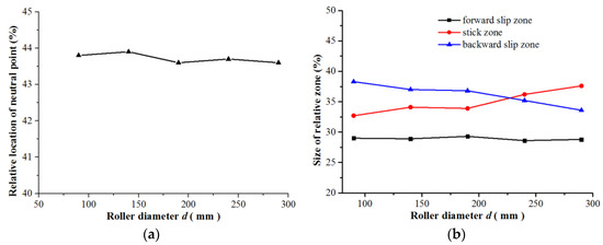 According to the numerical results, the relative location of the neutral point in rolling bite was about 43.8%, which was unchanged with the variation of diameter of the roller, as shown in Figure 12a. This is consistent with the study by Kijima [29,30]. When the diameter of the roller increased, the percentage of the forward slip zone was unchanged. The percentage of the stick zone increased slightly, and the percentage of backward slip zone decreased slightly, as shown in Figure 12b. The variation of roller’s diameter changed the amplitude of the contact pressure and sliding distance, because the angle and length of the rolling bite changed.