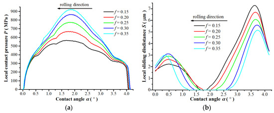 In a rolling process, the blank is driven into the gap between the rotating rollers by friction. Hence, friction coefficient is significant to the contact response. Figure 13 shows the predicted local contact pressure and local sliding distance of the roller with varying friction coefficients while the values of other parameters were kept constant. When the friction coefficient was increased from 0.15 to 0.35, the local contact pressure increased, and the magnitude of the contact pressure increased from 565 to 909 MPa, as shown in Figure 13a. Because the greater friction exacerbates the contact between roller and blank, the local contact pressure and rolling force increased (the rolling force perpendicular to rolling direction increased from 3.5 to 5.0 kN/mm). Hence, the hill-shaped profile of the local contact pressure was sharper, which was confirmed by Shahani et al. [31] and Yadav et al. [32]. The local sliding distance decreased in the backward slip zone, and the magnitude decreased from 7.28 to 5.15 μm. The intensified contact impeded the sliding between the roller and the blank, hence, the sliding decreased in backward slip zone. However, the local sliding distance increased in forward slip zone, and the magnitude increased from 2.2 to 2.9 μm, as shown in Figure 13b. A bigger friction coefficient raised the values of forward slip and the plate’s speed at exit section, which agrees with Wang et al. [33].