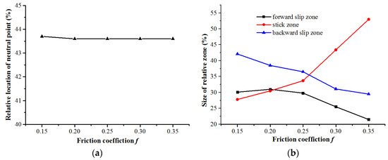 According to the numerical result, the relative location of the neutral point in rolling bite was about 43.8%, as shown in Figure 14a. When the friction coefficient increased, the percentage of the stick zone was increased significantly, and the percentage of the forward slip zone and backward slip zone shrank, as shown in Figure 14b. The reason is that a higher friction coefficient enlarges the region of saturated friction, and many more nodes at the boundary of slipping zone stick with roller. Gao et al. obtained similar results [25].