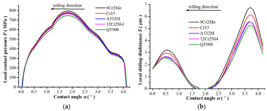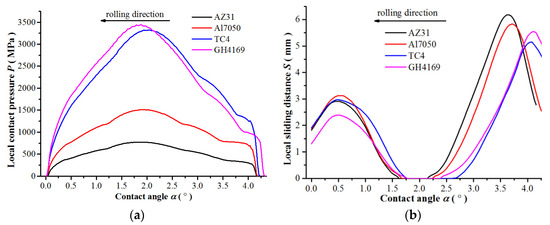 Contact pressure (a) and local sliding distance (b) distribution over the rolling bite with different material properties of roller (other parameters were constant with = 1.5 mm, = 25%, = 190 mm, = 0.25, AZ31).