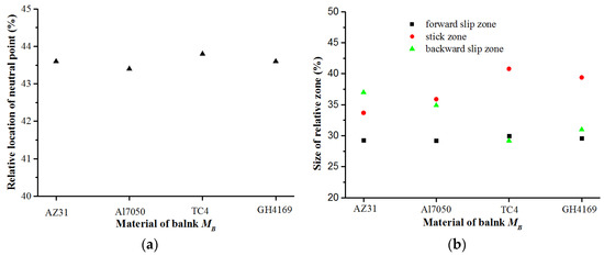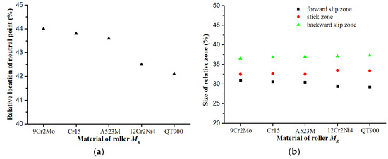 Relative location of the neutral point (a), and percentage of the stick and slip zones (b) in rolling bite with different material property of roller (other parameters were constant with = 1.5 mm, = 25%, = 190 mm, = 0.25, AZ31).