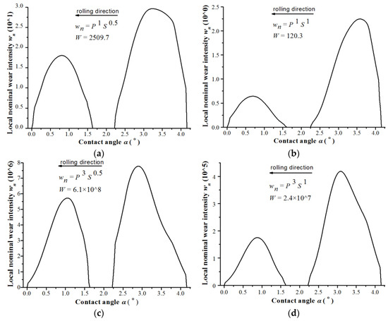 It is worth commenting that the reduction of the roller due to accumulated wear doesn’t affect the application of Equation (4) to analyze the wear intensity or the application of Equation (6) to analyze the wear per one rolling cycle. However, the roller size should be updated in the estimation of the accumulated wear due to rolling cycles. An insight into the wear behavior of the roller for one rolling cycle can be obtained based on Equations (4)–(6). Although the empirical constants in Equation (4) are usually fitted using data obtained from simulated laboratory test, in general, it has been observed that ≥ 1 (with typical values in the range of 1–3), and ≤ 1 [6]. Hence, the values of m and n are chosen within these ranges in the following discussion. According to the local contact pressure and local sliding distance presented in Figure 7, the distribution of the local nominal wear response can be obtained by using Equation (4), and the total nominal wear of the roller over one rolling cycle can be obtained by using Equation (6). The results are presented in Figure 19 with different empirical constants.