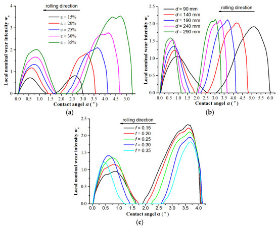 Local nominal wear intensity over the rolling bite with the different rolling parameters ( = 1, = 1). (a) Local nominal wear with the different thickness reductions; (b) Local nominal wear with the different rollers’ diameters; (c) Local nominal wear with the different friction coefficients.