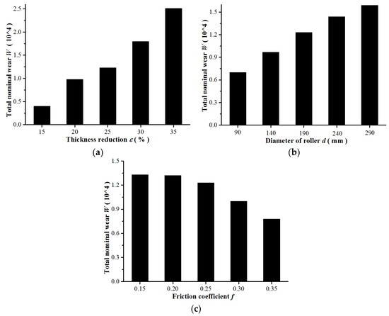 Total nominal wear per unit on the roller during one rolling process. (a) Total nominal wear with the different thickness reductions; (b) Total nominal wear with the different rollers’ diameters; (c) Total nominal wear with the different friction coefficients.