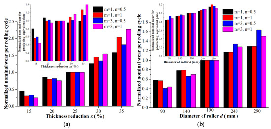 For different empirical constants m and n in the Equation (4), the magnitudes of the local nominal wear vary significantly, as shown in Figure 19. Hence, the magnitude of the total nominal wear per rolling cycle changes greatly. In order to investigate the wear of roller when using different empirical constants m and n, the total nominal wear of the roller per rolling cycle is normalized by its value when using the same constant m and n with the standardized parameters ( = 25%, = 190 mm, = 0.25). The normalized wear results are shown in Figure 22. Meanwhile, the total nominal wear of the roller was considered using the different thickness reduction and diameter of roller for producing same rolled plates, the results are shown in the insets of Figure 22a,b.