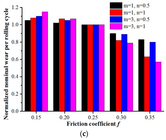 The friction coefficient is the third important parameter to the nominal wear intensity and the total nominal wear per rolling cycle, as demonstrated in Figure 20c, Figure 21c and Figure 22c. The total nominal wear per rolling cycle is smaller if the friction coefficient is higher. This finding can be explained by the fact that the stick zone increases and the two slip zones shrink if the friction coefficient increase, as shown in Figure 14b. As a result, the local wear intensity decreases in the forward slip zone, as shown in Figure 20c.