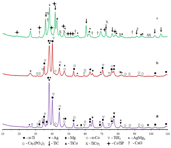 The compositions of the reaction mixtures were calculated from the equation (70% − X)(Ti + 0.5C) + 20% Co + 10% Ca3(PO4)2 + X% (3Mg + 2Ag), where X is the charge mixture parameter equal to 13% and 24%, which conforms to the Ag and Mg content of 4 and 6 at. % as well as 8 and 12 at. %, respectively, in the composition.