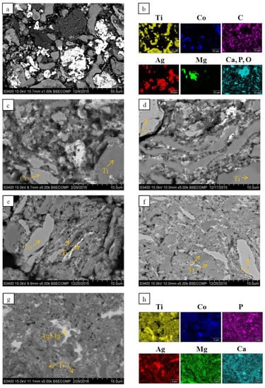 Figure 2f presents the microstructure of the composite particle after 9 min of the MA. The composite’s lamellar structure formed earlier has been destroyed after being exposed to the shear deformation that occurs during the intense mechanical treatment. A homogeneous distribution of the Ca3(PO4)2, C, Ag, and Mg components with titanium and cobalt inclusions with sizes up to 10 μm is observed in the particles. After the mechanochemical synthesis at 11 min of the MA, the structure and morphology of the composite particles does not practically change and consists of grains of the evenly distributed phases of the reaction products (Figure 2g,h). In addition to that, using the EDS method for the structure, Ti particles sized at 6–8 μm have been detected that were not found through the XRD method (Table 1) because of the overlapping diffraction lines of the different phases.
