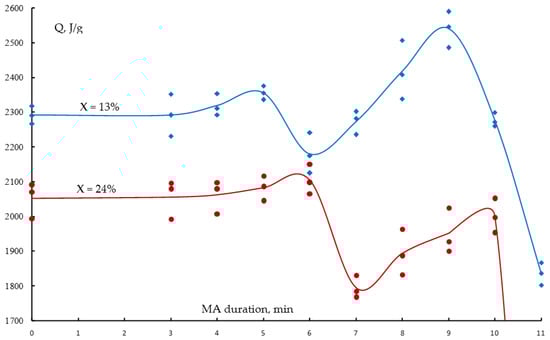 Figure 3 presents the results of the calorimetric studies of the Ti–C–Co–Ca3(PO4)2–Ag–Mg powder mixtures at X = 13 and 24% in the form of a chart of the dependence of the generated specific heat on the MA duration. Due to the possibility of several simultaneous reactions with different thermal effects in the multicomponent system during the SHS, the obtained dependencies have complicated profiles that differ from the standard parabolic one [13,14].