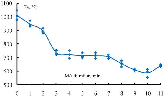 Figure 4 presents the results of measuring the self-ignition temperature (Tig). The Tig of the non-activated mixture prepared in the BRM was equal to ~1010 °C. After 3 min of the MA, the self-ignition temperature decreases by 275 °C. An increase of the MA duration up to 7 min does not practically change the Tig. Within the range of 7–10 min, the self-ignition temperature decreases from 710 °C to 590 °C. A further increase in the activation time leads to the growth of the Tig, which corresponds to the results of the heat generation measurements (Figure 3) within this range, and is explained by the starting chemical conversions that decrease the system’s energetic capabilities.