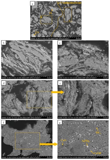 The microstructures of the stopped combustion front (SCF) from the Ti–C–Co–Ca3(PO4)2–Ag–Mg mixture at X = 13% activated for 5 min in various areas of the quenched sample. (a) general view of the sample’s SCF; (b) initial charge mixture; (c) combustion zone; (d,e) post-combustion zone; (f,g) final product.