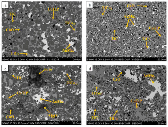 Figure 6 provides the microstructure of the synthesis products. The compact materials consist of circular grains of titanium carbide located in the matrix based on TiCo and TiCo2 intermetallics as well as ternary CoTiP compound. The average size of the carbide grains in the sample synthesized from the BRM mixture (Figure 6a) equals to 2.4 μm. The CaO phase is located in the intergranular areas in the form of faceted crystals. The light-colored irregular inclusions sized from 4 to 6 μm are the phase of the silver-based solid solution, in which 10.5–12.5 at. % of Mg is dissolved, according to the results of the energy-dispersive spectroscopy analysis.