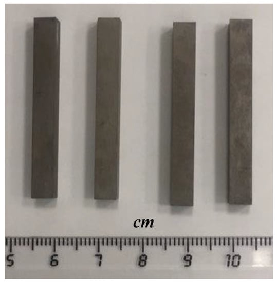 The optimization of the technological regimes of the force SHS-pressing technology for the Ti–C–Co–Ca3(PO4)2–Ag–Mg reaction mixtures at X = 13% allowed us to produce electrodes with a section of 4 × 4 mm and a length of 40 mm (Figure 7) for the pulsed electrospark deposition of bioactive coatings that have an antibacterial effect. The measured residual porosity of the materials lies within the range of 5–10% optimal for PED. It can be expected that an application of MA to the reaction mixtures will make it possible to enhance the homogeneity of the distribution of alloying additives in the electrodes, which will improve the mechanical and functional properties of the coatings, to which further works will be dedicated.