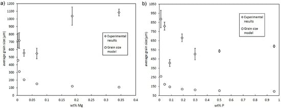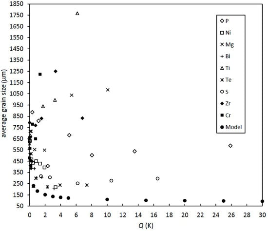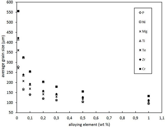 - Contradictory results were found for Mg, P, Ti, Zr, and Cr, as grain size decreases at low alloy concentrations. However, excessive grain coarsening can be observed with increasing solute content.