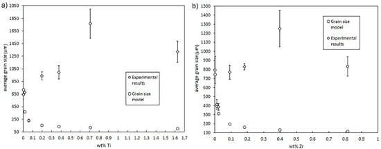 - It is assumed that variations in grain size, as found for Mg, P, Ti, Zr, and Cr, result from a change in the nucleating particle density of the melt that may occur due to reactions of the added alloying elements with particles in the initial melt. Significant decreases in grain size, as found for Ti and Zr, are supposed to be due to the in situ formation of potent nucleation sites, potentially with residual O. Excessive grain coarsening with increasing solute content may occur due to the removal of nucleating particles. The model shows that the difference in the actual number of particles before and beyond the transition point must be in the range of several orders of magnitude.