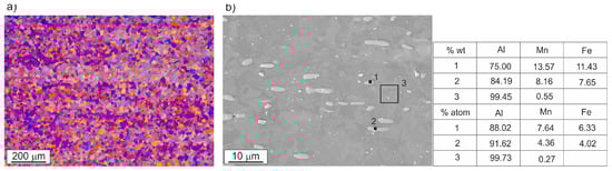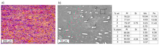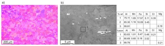 The characteristic microstructures and the phase analysis of the investigated alloys are shown in Figure 1, Figure 2, Figure 3, Figure 4, Figure 5, Figure 6, Figure 7 and Figure 8. Additionally, Figure 1b, Figure 2, Figure 3, Figure 4, and Figure 5b show the results of point analysis. All tested alloys have a regular shape of grains, with a mean grain diameter of 20 μm for AA3103 and AA5049, 35 μm for AA6063, and 70 μm for AA6060.