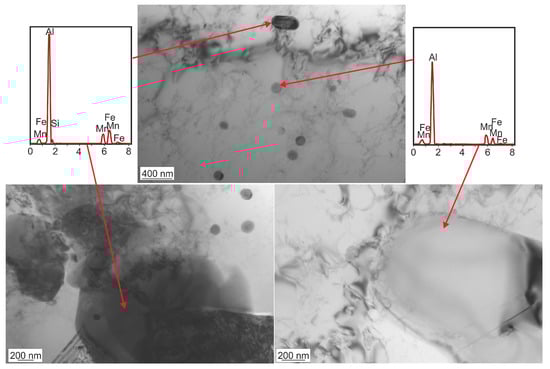 In the microstructure of all tested alloys, numerous evenly spaced precipitates of the size from a few nanometres up to several of microns were observed. The precipitates were most numerous in the 3103 alloy (Figure 1). Studies of the chemical composition in microregions carried out by EDS showed that in both alloys, i.e., 3103 and 5049, the precipitates were rich in Mn and Fe. On the other hand, TEM analysis of the chemical composition of these precipitates has proved that some of them contained silicon. In microscopic images, the silicon-containing precipitates were visible as dark grey particles, while the silicon-free precipitates had a bright colour (Figure 1b, Figure 2, Figure 3b and Figure 4). In the microstructure of the 6060 and 6063 alloys, iron-rich phases (bright-colour precipitates) and magnesium-rich phases were present. Magnesium was also traced in the alloy matrix (Figure 5).