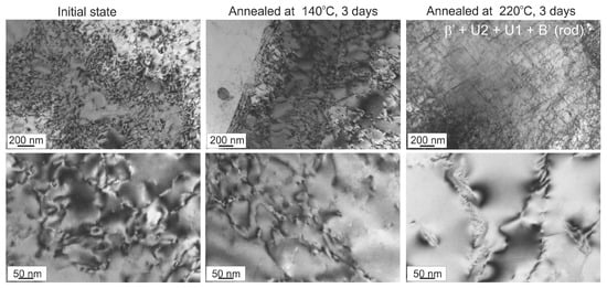 Figure 10 and Figure 11 show selected TEM images of the microstructure of 6060 and 6063 alloys in the initial state and after annealing at 140 °C and 220 °C for three days.
