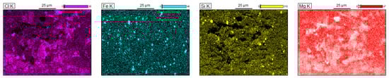 Chloride ions from the corrosive atmosphere can react with the Al3+ cations and form aluminium chloride. The possible corrosion products consist of Al(OH)3, Al2O3, and AlCl3 [22]. Figure 16 shows the microstructure of the AA6063 alloy and maps of the distribution of selected elements on the surface of the tube subjected to corrosion testing. Studies have confirmed the occurrence of the previously mentioned corrosion products.