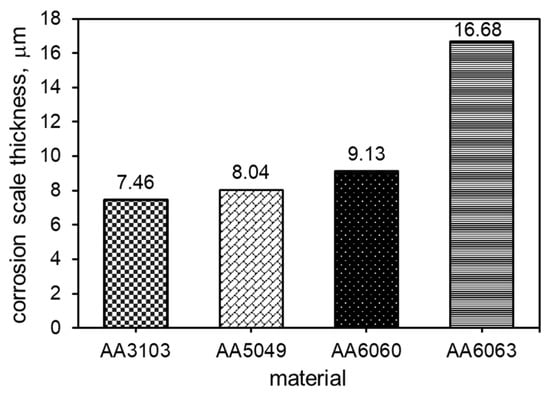 The measured thickness of the scale formed on the test tubes during the salt spray corrosion test depended on the alloy grade. The thickness of the scale formed on the 3103, 5049, and 6060 alloys was comparable and measured approximately 7.5–9 μm. Studies have shown that the thickest layer of scale was formed on the 6063 alloy; its average thickness was 17 μm (Figure 17).