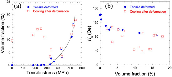 (a) Volume fraction of α′-martensites as a function of tensile stress. (b) Coercivity as a function of volume fraction. The solid and open symbols denote the data before and after cooling at 77 K for five minutes.