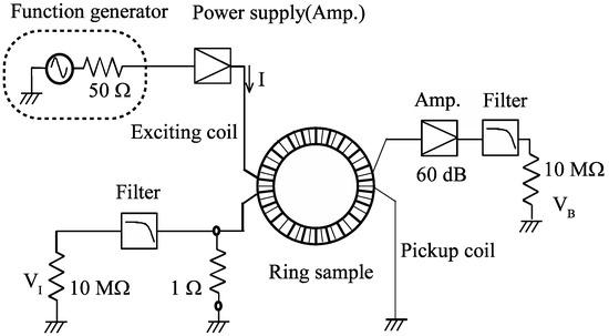 In Figure 2, a setup of our minor-loop measurement system is schematically shown. For the ring sample wound with both exciting and pickup coils, a set of magnetic minor hysteresis loops with various field amplitudes (Ha) up to 20 kA/m were measured using a fluxmeter. Triangular voltage with a frequency of 0.2 Hz (obtained from a function generator) was applied to a bipolar power supply. The bipolar power supply converts the voltage to current and amplifies it. The amplified current was then applied to the exciting coil to generate a cyclic magnetic field; this magnetized the sample. The magnetic field within the sample was obtained from the voltage across a 1-ohm resistance connected to the exciting coil in series. The induced voltage of the pickup coil was amplified with a gain of 60 dB and then purified by a low-pass filter with a cutoff frequency of 40 Hz. After this signal processing, the induced voltage was integrated to obtain a magnetic flux within the sample. A set of minor hysteresis loops was measured by gradually increasing the amplitude of the wave current. The step of the increase of Ha was about 100 A/m. Before measuring each minor loop, the sample was demagnetized with a decaying alternating magnetic field with a frequency of 10 Hz. These minor loops are different from the major hysteresis loops obtained with Ha that are sufficiently large for saturation. Figure 3a shows an example of a set of minor loops we measured.