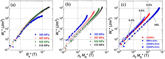 Figure 4a shows the double logarithmic plot of the relationship between Ba* and WF* taken at various tensile stresses. Unlike usual soft ferromagnetic materials, it was found that the power law relationship does not hold true for ferromagnetic α′-martensites formed in an austenitic matrix. Since high magnetic fields are required to magnetize the α′-martensites, vacuum permeability due to the applied fields is considered to significantly contribute to the observed flux density. In addition, the paramagnetic permeability of an austenitic matrix also contributes because the volume fraction of ferromagnetic martensites is not so high. Therefore, the magnetic flux density, or B(H), is no longer approximated by µ0M(H) due to the sample magnetization; B(H) would be given by a summation of µ0M(H), µaH, and µ0H due to the ferromagnetic α′-martensites, austenitic matrix, and applied field, respectively, as shown in Figure 3b. Here, µ0 is the vacuum permeability and µa is the paramagnetic permeability of the austenitic matrix. Consequently, the properties of the B(H) loop such as Ba* shown in Figure 3b is largely different from the corresponding maximum magnetization (Ma*) in the µ0M(H) loop. This is the reason why the scaling rule used for soft ferromagnetic materials does not hold true for ferromagnetic α′-martensites formed in an austenitic matrix.
