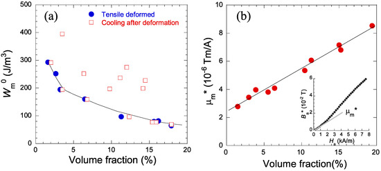where Wm0 and nm are a coefficient and power law exponent, respectively, and BR* is the remanent flux density of a minor loop. The normalization constant was set to 1 in this study. Least-squares fits to Equation (2) yielded an almost constant value of nm = 1.40 ± 0.04. Here, minor loops with Ha below 4 kA/m were used for the fits (Figure 3a). This value is independent of the volume fraction of α′-martensites. Figure 5a shows the minor-loop coefficient as a function of volume fraction. For the strain-induced α′-martensite, the coefficient monotonically decreases with the volume fraction; this is consistent with the behavior of coercivity, as shown in Figure 1b. This reflects the increase of martensite size alongside the volume fraction; this is because the pinning strength of magnetic domain walls at the α′-γ phase boundary weakens with the increasing volume-surface ratio [9,10].