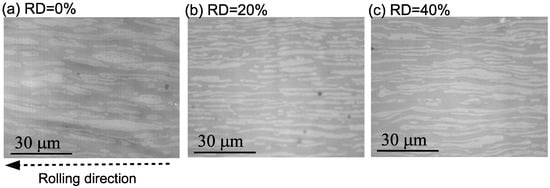 Figure 7a shows optical microscope images of the longitudinal section view for the RD = 0% sample. Dark and light gray regions respectively represent α and γ phases. This steel consists of both ferromagnetic α and non-magnetic γ phases. Image analysis for different locations of specimens shows that the volume fraction of α and γ phases in the present steels is 60 ± 3% and 40 ± 3%, respectively. For the RD = 0% sample, the γ phase is homogeneously distributed like an island, and the thickness of both phases is reduced after cold rolling, (Figure 7b,c). Measurements showed that saturation magnetization is almost constant for a RD of up to 90%, indicating that no martensitic phase transformation in the γ phase takes place up to RD = 90%.