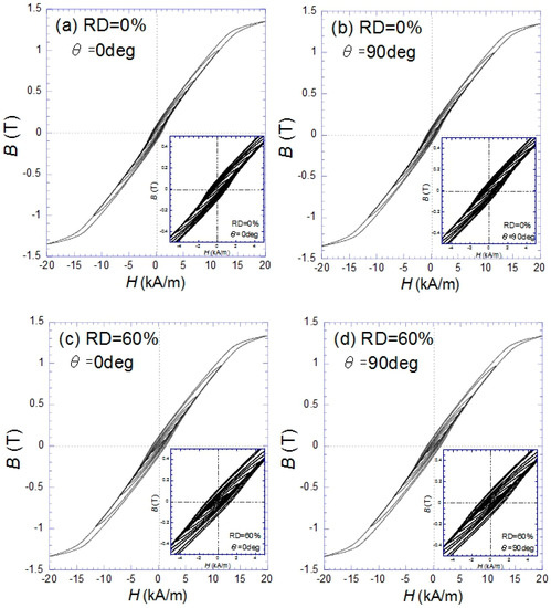 A set of minor B(H) loops before and after cold rolling. The angle θ represents the rolling direction; (a) RD = 0% and θ = 0°, (b) RD = 0% and θ = 90°, (c) RD = 60% and θ = 0°, and (d) RD = 60% and θ = 90°.