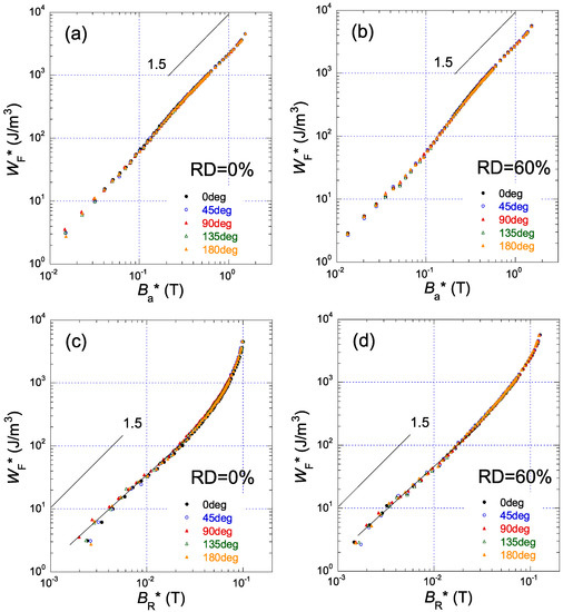 Figure 9a,b show relationships between hysteresis loss and maximum flux density, before and after cold rolling for different angles, plotted in a double logarithmic scale. For comparison, the slope of 1.5 is given. When Ba* is above approximately 3 × 10−1 T, the curves for all values of θ (obtained before and after rolling reduction) exhibit a linearity; this suggests that a power law exists between WF* and Ba*. For the relationship between WF* and BR*, a linearity was also observed from the low to medium BR* range (at less than approximately 3 × 10−2 T) for all reductions and values of θ (Figure 9c,d). This indicates a power law relationship between WF* and BR*. Assuming Equations (1) and (2) for the WF*-Ba* and WF*-BR* curves, respectively, exponents of nF = 1.48 ± 0.02 and nm = 1.34 ± 0.05 were obtained. Here, minor loops in the range of Ha from 3 to 12 kA/m were used to determine WF0, while for Wm0, minor loops with Ha from 0.2 kA/m to 2 kA/m were used. The exponent values are almost the same as previously reported values for ferromagnetic materials [2,3], indicating the universality of the hysteresis scaling law for minor loops.