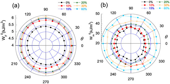 Figure 10a,b show the θ-dependence of minor-loop coefficients WF0 and Wm0, respectively, taken at different levels of rolling reduction. As shown in Figure 10a, WF0 is nearly isotropic in shape; no pronounced θ-dependence was observed for all the reductions. As the rolling reduction increases, WF0 monotonically increases. This increase can be due to an increase of dislocation density with rolling reduction [18]. On the other hand, the θ-dependence of Wm0 is slightly anisotropic in shape; the anisotropy seems to depend on the level of rolling reduction. At low rolling reduction (less than approximately 10%), Wm0 maximizes when magnetizing direction is perpendicular to the rolling direction, or when θ is at approximately 90° and 270°. As the rolling reduction increases, the θ-dependence becomes gradually isotropic in shape; Wm0 then exhibits the maximum value when θ is at approximately 0° and 180°, at a rolling reduction above 30%. This anisotropy in Wm0 is opposite to that observed at a low rolling reduction. The magnitude of Wm0 exhibits a steady increase with rolling reduction, reflecting an increase of dislocation density.