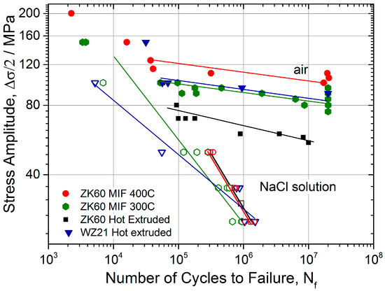 - Wittke, P.; Klein, M.; Dieringa, H.; Walther, F. Corrosion fatigue assessment of creep-resistant magnesium alloy Mg–4Al–2Ba–2Ca in aqueous sodium chloride solution. Int. J. Fatigue 2016, 83 Pt 1, 59–65. [Google Scholar] [CrossRef]
