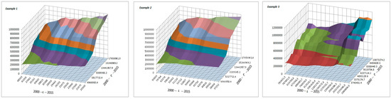 Figure 1 represents static models from Examples 1–3 graphically. Function distribution in first two models (Examples 1 & 2) are similar, as the economies of scale were declining (EP/C + EP/L < 1). Nevertheless, the distribution of the function presented in last model (Example 3, growing economies of scale, EP/C + EP/L > 1) differs. A similar situation has been observed in models where the dependent variable was described by metallurgical production sold, i.e., a negative correlation between variable P (output) and variable L (number of employees or actual working time in the steel industry in Poland in years 2000–2015), and a positive correlation between variable P (output) and variable C (noncurrent assets, noncurrent assets less depreciation costs, with regard to the production capacity of the noncurrent assets in Polish steel industry).