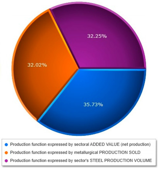 For each model, we hypothesized that a non-linear (power) relationship exists between the dependent variable P and explanatory variables L (labour) and C (capital). Depending on the tested production function model, the dependent variable P meant: (i) sectoral added value (net production) (PLN); (ii) production sold (PLN); and, (iii) steel production volume (mln. tons). Only statistically valid (positively verified) production function models have been accepted for further research, i.e., sectoral added value and production sold—contrary to models that are expressed by steel production volume [24].