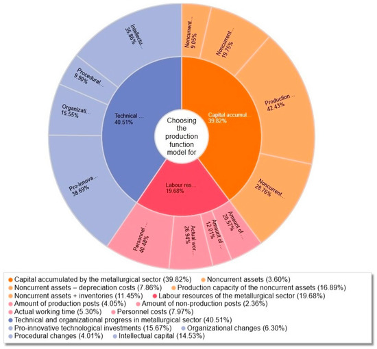 A graphical presentation of the prioritization of all decision criteria presented in Table 2, with regard to the main goal of AHP decision-making model (choosing the production function model for an optimal measurement of the restructuring efficiency of the Polish metallurgical sector in years 2000–2015) can be found on the hierarchical pie chart below (Figure 4). Criteria, sub-criteria, and data are the same as in Table 2.