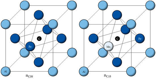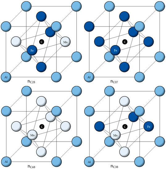 being the molar fraction of Fe, Mn, and Al, denying the existence of other substitutional alloying elements and ignoring C, since carbon is an interstitial alloying element. Since diffusion rates of substitutional atoms in austenitic steels are very low, it is assumed that the distribution of substitutional elements according to Equation (5) is fixed and that the carbon atom is distributed in accordance with a minimum ordering energy. For clusters of nitrogen and chromium, this approach has been shown to be a realistic approximation, since the presence of nitrogen does not negatively influence the homogeneous distribution of chromium [