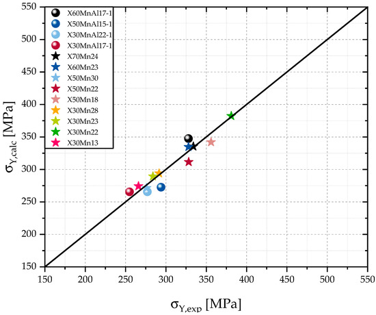 . In the case of solid solution strengthening for X30MnAl17-1, this can be explained by the low Mn content of 16.80 wt. % compared to the 22.00 wt. % used as a basis of calculation of
