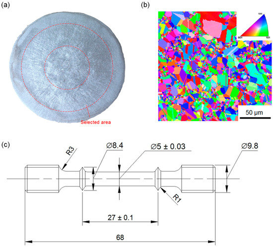 (a) Cross section of the extrusion ingot. The annular region between red dashed lines is the selected area to manufacture the specimens; (b) Microstructure of the as-extruded material; (c) Specimen drawing for creep test (unit: mm).
