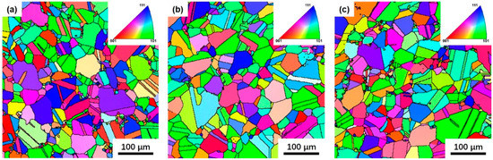 The color map of grains after different heat treatments. (a) Furnace cooling; (b) Air cooling; (c) Oil quenching.