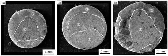 Macro fracture after creep tests. (a) Furnace cooling; (b) Air cooling; (c) Oil quenching. White dotted lines divide the fracture into three areas: ① The initial rupture area; ② The propagation area; ③ The final rupture area.