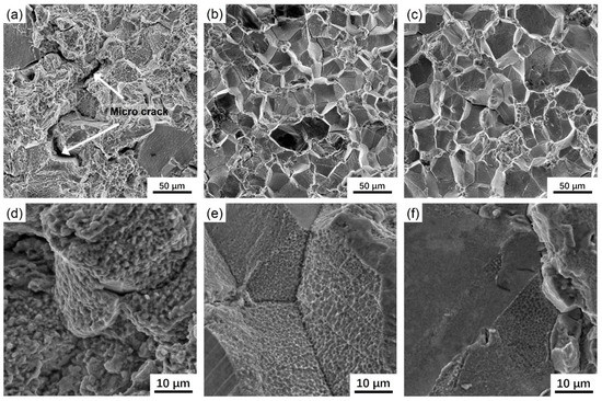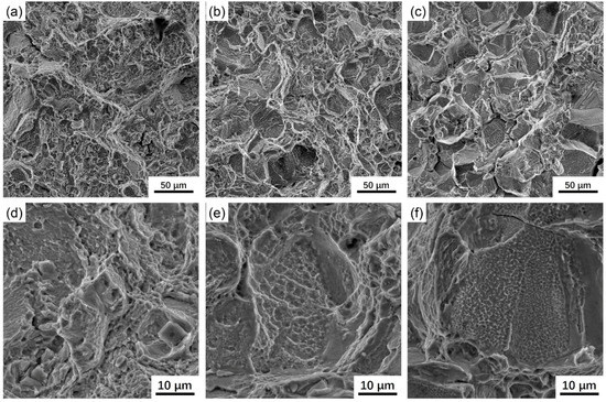 Figure 6 shows the micro morphology of the initial rupture area, small cracks are found in the furnace cooling specimen, which are marked with white arrows in Figure 6a, and the rugged surface is full of steps. For the air cooling specimen, ubiquitous faceted grains are found at the fracture boundaries (Figure 6b), which is different from the observation in the furnace cooling specimen. Small dimples can be seen on the grain facets (Figure 6e), which means that the fracture is not brittle. For the oil quenching specimen, we can also see small dimples in the initial region, but the grain facets are smoother than the air-cooling specimen, with fewer dimples found in the plane (Figure 6f).