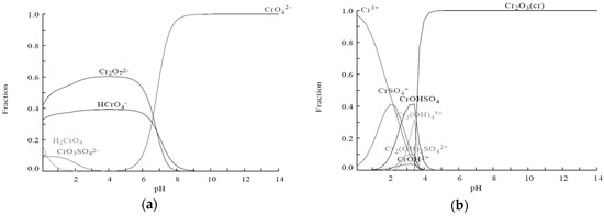 Speciation diagrams of (a) Cr (VI) and (b) Cr(III). [Cr] = 0.05 mol·L−1, ionic strength = 0.1 mol·L−1, T = 25 °C. Calculation performed with Medusa by using the thermodynamic data reported in Table 2.
