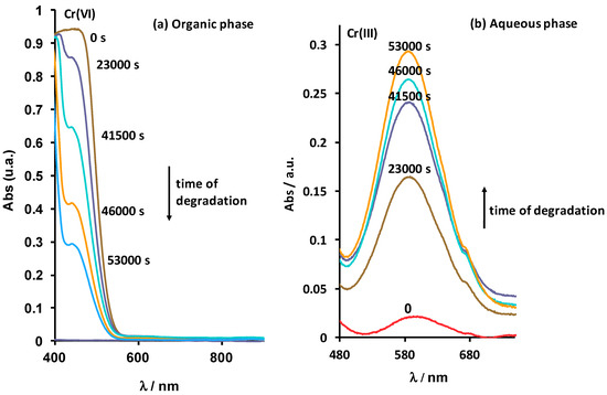 The UV-Visible spectra of the organic and aqueous phases were recorded throughout the degradation test (Figure 2). Figure 2a shows a peak located at 417 nm in the spectrum of the organic phase attributed to Cr(VI) extracted by tri-n-octylamine [10]. The intensity of this peak decreased over time. Figure 2b shows a peak located at 587 nm in the spectrum of the aqueous phase corresponding to Cr(III) [10]. The intensity of this peak increased over time. The decrease of Cr(VI) concentration in the organic phase and the increase of Cr(III) concentration in the aqueous phase can be attributed to the Cr(VI) being stripped from the organic phase into the aqueous phase due to redox reactions responsible for the reduction of Cr(VI) into Cr(III). Cr(III) was spontaneously stripped from the organic phase into the aqueous phase likely due to its having a weak affinity with the extraction solvent because of the electrostatic repulsion between Cr(III) and protonated tri-n-octylamine (see speciation diagram of Cr(III) in Figure 1b, which shows that Cr(III) exists as a cation species).