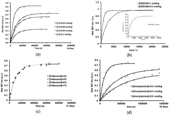 Variation of the absorbance at 587 nm of the aqueous phase during the chemical degradation of 0.2 mol·kg−1 tri-n-octylamine in n-dodecane modified by 1-tridecanol. (a) aqueous phase = 0.1 mol·kg−1 H2SO4 + Cr(VI) at different concentrations; organic phase: 0.2 mol·kg−1 tri-n-octylamine + 5 wt % 1-tridecanol; (b) aqueous phase = different concentrations of H2SO4 + 0.05 mol·kg−1 Cr(VI); organic phase: 0.2 mol·kg−1 tri-n-octylamine + 5 wt % 1-tridecanol; (c) aqueous phase = 0.1 mol·kg−1 H2SO4 + 0.05 mol·kg−1 Cr(VI); organic phase: 0.2 mol·kg−1 tri-n-octylamine + different concentrations of 1-tridecanol, (d): aqueous phase = 0.1 mol·kg−1 H2SO4 + 0.05 mol·kg−1 Cr(VI); organic phase: different concentrations of tri-n-octylamine + 5 wt % 1-tridecanol. Temperature = 25 °C. Data were fitted with Equation (4).