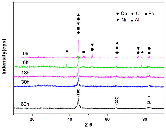 XRD patterns of CoCrFeNiAl HEA during 60 h milling.