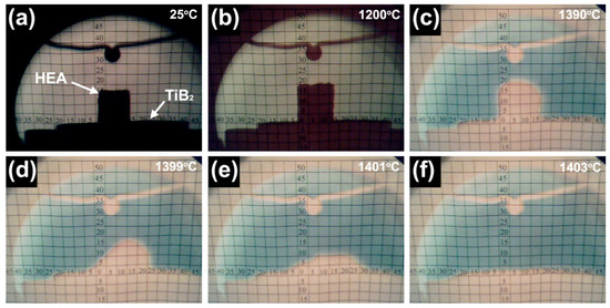 Figure 2 shows the results of sessile drop experiments. The contact angles under different temperatures (from 25 °C to 1403 °C) between HEA and the TiB2 substrate can be seen from these images. Figure 2b reveals that there is no obvious change for either HEA or the ceramic substrate, other than some expansion when the temperature reached 1200 °C. When the temperature rises to 1390 °C, the HEA cylinder starts to melt, and the contact angle between the HEA cylinder and the ceramic substrate can be observed. As shown in Figure 2c–e, when the temperature exceeds 1390 °C, the HEA melts fast, and the contact angle becomes much smaller. Figure 2f indicates that at the end of this process, the molten HEA almost completely spreads onto the substrate. According to the available literature, this result indicates excellent wetting properties between TiB2 ceramic and molten CoCrFeNiAl HEA [22]. Wettability is one of the most important aspects for the fabrication of metal-ceramic composites. Good wettability will promote the sinterability of TiB2 ceramics.