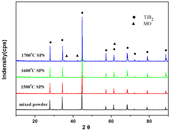 The XRD patterns of the TiB2-5 wt. % CoCrFeNiAl mixture and the as-sintered bodies are shown in Figure 3. Only a TiB2 phase is observed in the mixed powder, and no obvious HEA peak can be observed. The invisibility of the HEA peaks can be ascribed to: Firstly, the MA process causes the low crystallinity of HEA. MA leads to some lattice distortions such as random solid solution, nanoparticles, and the amorphous phase [23]. In addition, HEA only accounts for 5% of the total powders, and cannot be detected. Secondly, both TiB2 and the as-milled CoCrFeNiAl HEA have peaks at a 2θ of about 44.5°. Therefore, it is difficult to distinguish the HEA peaks from the patterns. As a consequence, XRD, which is used to test the crystalline phase, cannot identify X-ray diffraction peaks whose intensity is not strong enough. Whether the HEA exists or not will be verified in the following discussion. As for the small metallic oxides (MO) phase in the XRD at 1700 °C, the elements with relatively low alloying degrees can exsolute from the HEA and react with the impurities from raw TiB2 powders to form some metallic oxides. This side reaction is a favorable way of eliminating impurities in raw TiB2 powder, thus promoting the sinterability of ceramics. Additionally, the peaks of brittle secondary borides (M2B, M23B6) cannot be observed in the as-sintered ceramics.